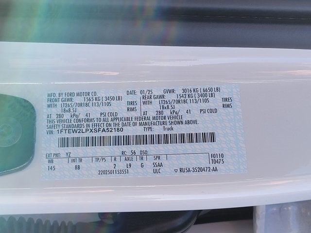 This 2025 Ford F-150 come equipped with, 4WD, 3.55 Axle Ratio, 4-Wheel Disc Brakes, 6 Speakers, ABS brakes, Air Conditioning, Alloy wheels, Auto High-beam Headlights, Brake assist, Bumpers: body-color, Compass, Delay-off headlights, Driver door bin, Dual front impact airbags, Dual front side impact airbags, Electronic Stability Control, Emergency communication system: SYNC 4 911 Assist, Front anti-roll bar, Front Bucket Seats, Front Center Armrest, Front reading lights, Front wheel independent suspension, Fully automatic headlights, GVWR: 6,650 lbs Payload Package, Heated door mirrors, Illuminated entry, Low tire pressure warning, Occupant sensing airbag, Outside temperature display, Overhead airbag, Overhead console, Panic alarm, Passenger door bin, Passenger vanity mirror, Power door mirrors, Power steering, Power windows, Radio data system, Rear Parking Sensors, Rear step bumper, Rear window defroster, Remote keyless entry, Security system, Speed control, Split folding rear seat, Steering wheel mounted audio controls, SYNC 4 w/Enhanced Voice Recognition, Tachometer, Telescoping steering wheel, Tilt steering wheel, Traction control, Trip computer, Variably intermittent wipers, Voltmeter, Wheels: 18 Gloss Black, 4WD. Price includes: $1250 - Retail Bonus Cash. Exp. 03/31/2026 $2000 - Retail Customer Cash. Exp. 03/31/2026 $500 - Retail Bonus Cash. Exp. 03/31/2026